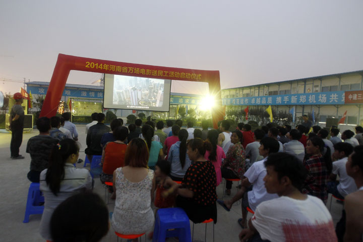 6月10日晚8時, 鄭州機場二期工程建設(shè)工地中建三局新鄭機場T2航站樓項目指揮部大院內(nèi)人聲鼎沸、歡歌陣陣,由中共河南省委宣傳部、河南省廣電局、鄭州機場二期工程建設(shè)指揮部主辦,鄭州市文化廣電新聞出版局、河南新農(nóng)村數(shù)字電影院線有限公司、鄭州商都數(shù)字電影院線有限公司、中建三局新鄭機場T2航站樓項目部承辦的2014年河南省萬場電影送民工活動啟動儀式如期舉行,300余名鄭州機場二期工程參建人員興致勃勃地觀看了河南影視制作集團出品的《永遠的焦裕祿》和《新少林寺》等影片。河南省委宣傳部常務(wù)副部長王耀;河南省新聞出版廣電局黨組副書記、副局長宋鳳仙;鄭州機場二期工程建設(shè)指揮部副指揮長、河南城際鐵路公司常務(wù)副總經(jīng)理劉光明等領(lǐng)導同志出席了啟動儀式。