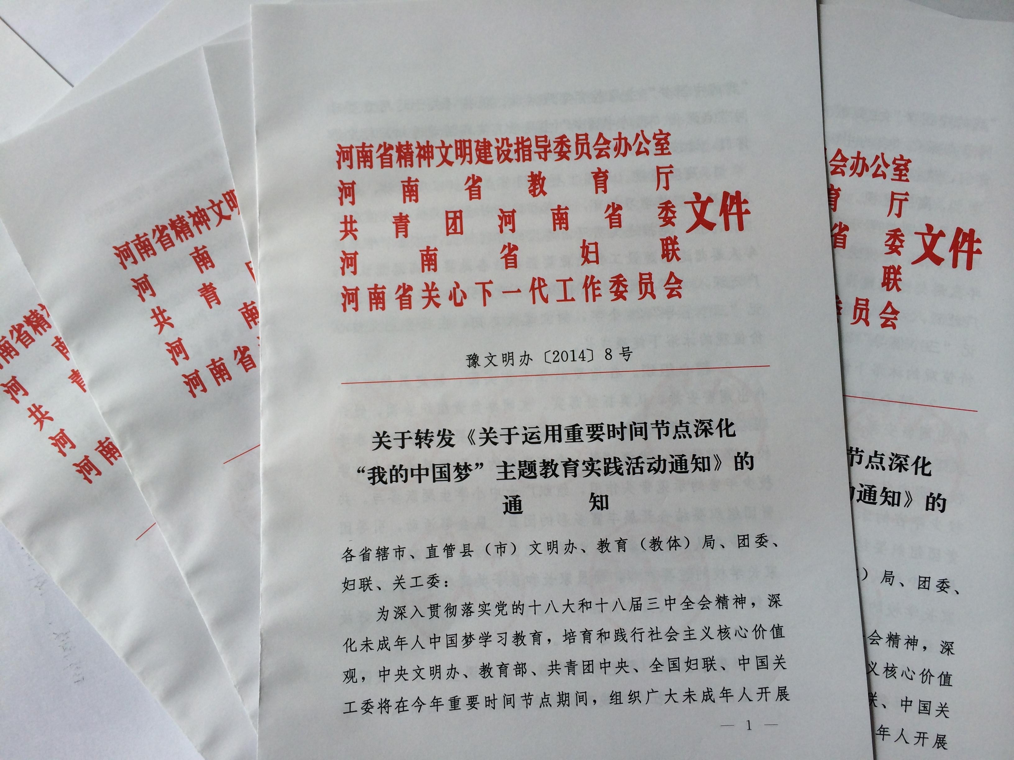 為深入貫徹落實黨的十八大和十八屆三中全會精神,深化未成年人中國夢學(xué)習(xí)教育,培育和踐行社會主義核心價值觀,中央文明辦、教育部、共青團(tuán)中央、全國婦聯(lián)、中國關(guān)工委將在今年重要時間節(jié)點期間,組織廣大未成年人開展“我的中國夢”主題教育實踐活動?,F(xiàn)將有關(guān)事項通知如下。