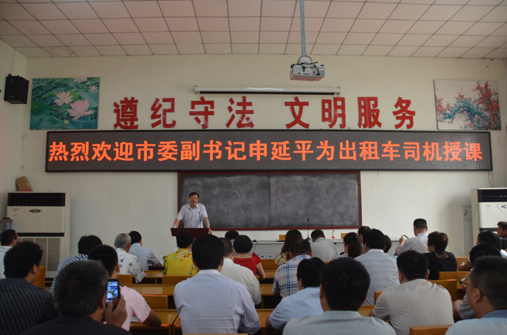 6月10日,濮陽市委副書記申延平到濮陽市出租車司機(jī)文明學(xué)校為200名出租車司機(jī)志愿者上課培訓(xùn)