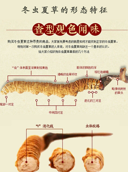 冬蟲夏草在密封后打開,聞起來有淡淡的腥氣味,淡草茹味。總之,冬蟲夏草入藥時(shí)須“草、蟲”兼?zhèn)?,藥性方佳,倘若缺一,則療效難全。若遇殘缺不全的蟲草,或只有蟲體而無子座,或只有子座而無蟲體;均為次品,此點(diǎn)最為重要,切勿忘記。在購買藥用冬蟲夏草時(shí),應(yīng)選擇色澤正常、發(fā)育良好、無病蟲害、無殘缺、無畸形、質(zhì)地良好而又干爽者。