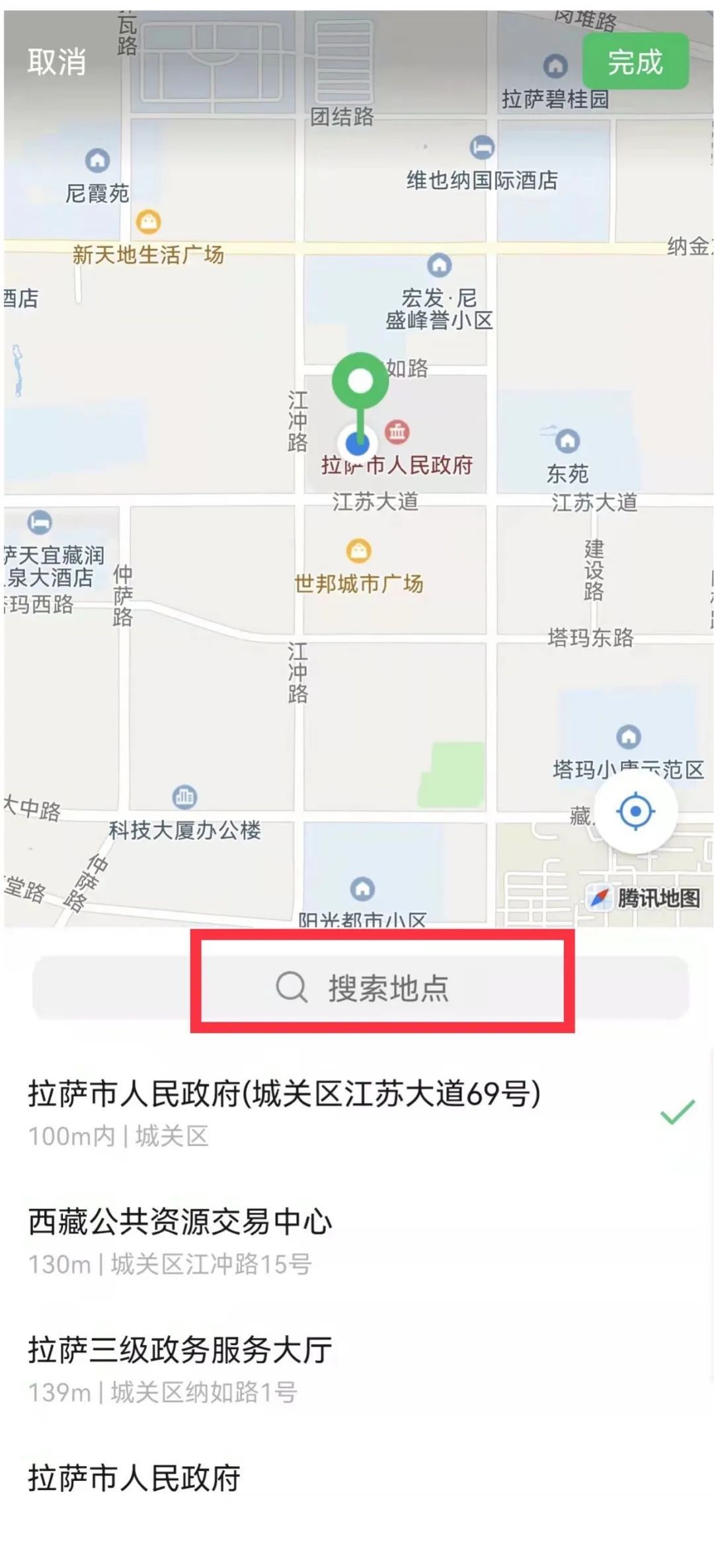 第三步:紅色位置,為搜索地點自行輸入地址定位點;藍色位置,為你所定位地點的管控街道(鄉(xiāng))和社區(qū)(村),請點擊。
