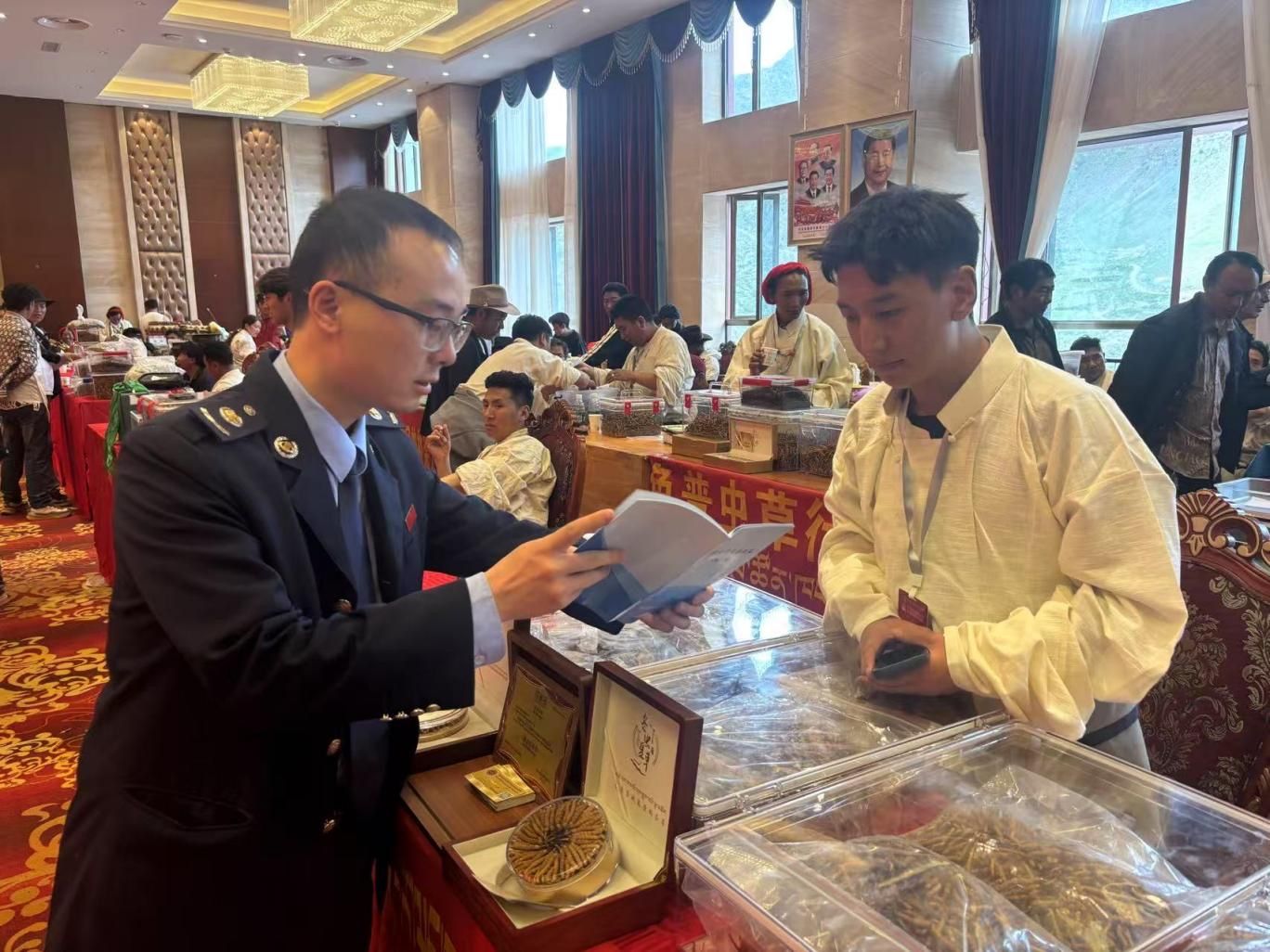 在蟲草交易活動開始前,兩縣稅務局開展了“稅惠政策答疑小課堂”,把“晦澀條文”解讀成大家都能聽懂的“明白話”,確保商戶“懂政策、會運用”,精準享受稅惠政策紅利。同時,在交易現(xiàn)場設(shè)立“蟲草辦稅答疑崗”,聚焦解答發(fā)票開具、免稅認定等高頻疑難問題,輔導商戶操作電子稅務局,“即問即答+實操輔導”雙管齊下,讓商戶“少跑腿、快辦稅”。