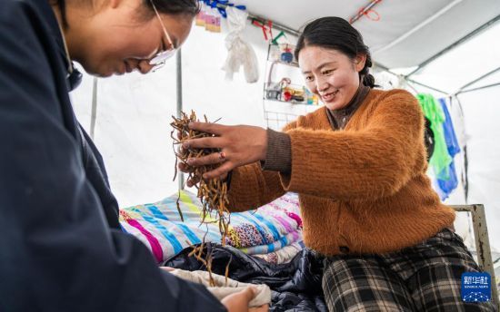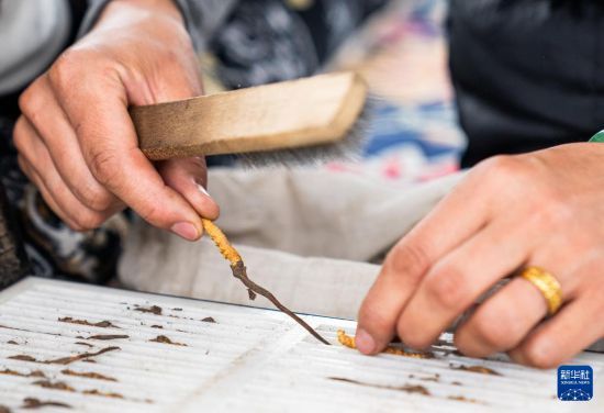 在那曲市索縣西昌鄉(xiāng),牧民將清理好的蟲草裝袋收納(5月18日攝)。新華社記者 丁增尼達 攝