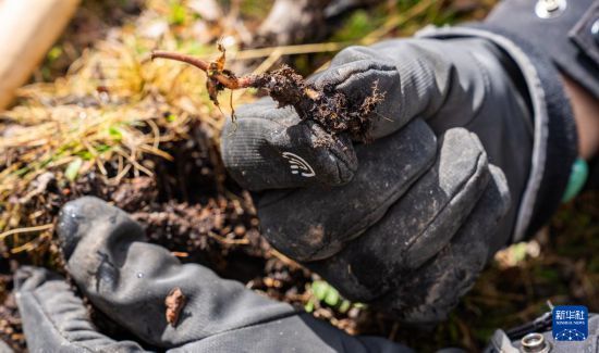 這是在那曲市索縣西昌鄉(xiāng)拍攝的剛採挖出的蟲草(5月18日攝)。新華社記者 丁增尼達 攝